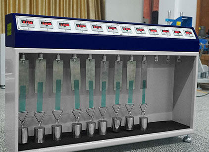 方法A:試樣在裁剪前,先去除最外的3-6層膠帶,裁剪最少3份12mm(或24mm)寬長約150mm的粘膠帶,試樣解卷后5分鐘內粘試在驗鋼板上,粘貼面積12×12mm2(或24×24mm2),用2kg±100的標準壓輥以10mm/s的速度來回輾壓三次,將不銹鋼三角環扣與試驗鋼板對齊,使試樣自由端綁定在不銹鋼三角環扣上。試樣準備好后在1分鐘內,將鋼板掛于試驗儀測試位上,輕輕掛上砝碼,工位自動開始計時,當粘膠帶自然脫落后,對應砝碼模組的數顯累時器記錄保持時間,測試結束,人工記錄數據并綜合數據評定膠帶粘合的持粘性。