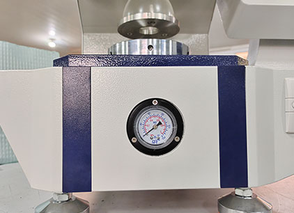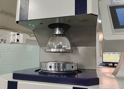 在儀器密封的油缸和壓紙座的容腔內(nèi),裝滿甲基硅油作為壓力傳遞的介質(zhì),當(dāng)電機帶動活塞勻速前進時,橡皮膜受到硅油的加壓而突起,此時夾持在膠膜上方,被上下夾盤固定住的試樣,均勻受力,直到試樣破裂,處理芯片鎖住最大壓力值,通過液晶屏顯示該壓力值,此壓力值即為本次試樣的耐破度。