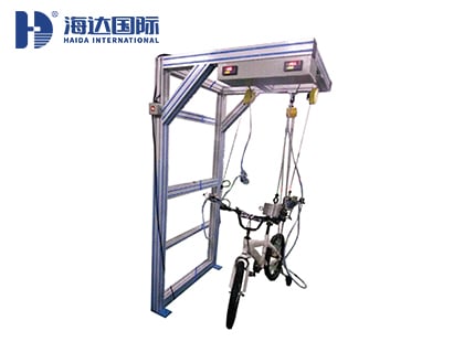 海達儀器HD-J230自行車閘皮試驗套具主要測試自行車整車的閘皮、閘盒強度,具體為于鞍座上放置100KG砝碼,每個閘把施加180N握軋力,整車前后各推動五次,推動距離不小于75mm,觀察閘皮、閘盒有無損壞。