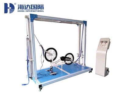 海達儀器HD-J239自行車車輪夾持力脫卸試驗機依據標準分別對前后車輪施加一定的力,測試車輪夾持裝置及快卸機構的強度,測試完畢后,前軸和前叉應無相對應移動,沿車輪的拆卸方向,在前軸兩側對稱地施加一個2300N的力,為時1min。